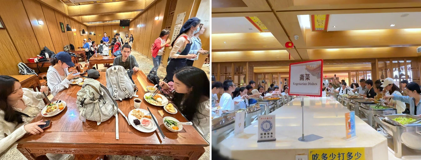 大嶺山峰巒疊嶂,樹木蔥蘢,溪流潺潺,野花競放,宛如一幅靈動的畫卷。活動當(dāng)天,大家按時集合出發(fā),車廂里,各車輛負(fù)責(zé)人(惠州大巴:李春漫;惠州中巴:陳小怡、丘宏亮;深圳中巴:付強(qiáng))帶隊自我介紹、講解活動規(guī)則,陳慧虹更是自駕提前抵達(dá)協(xié)調(diào)接駁車,一路歡聲笑語中,很快便抵達(dá)觀音寺。到達(dá)后,在委員和小組長安排下,百位同事有序進(jìn)入觀音寺齋飯?zhí)皿w驗齋飯。齋飯色彩斑斕,大家贊不絕口,還積極響應(yīng)光盤行動。